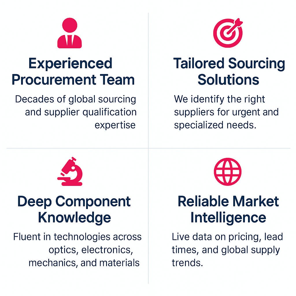 We offer end-to-end procurement and sourcing services for high-performance components used in medical imaging, nuclear medicine, defense, and aerospace systems.We collaborate with a global network of trusted suppliers to source and deliver precision parts, specialty metals, electronic assemblies, and custom-engineered components - all verified to meet your exact specifications.Our procurement capabilities include:Strategic sourcing of long lead-time and hard-to-find componentsSupplier qualification and performance monitoringCost analysis and value engineeringFull documentation and traceabilityInternational logistics and customs coordinationSeamless integration with your production planning and inventory systemsBy partnering with us, you gain access to a global supply network and a procurement team focused on quality, compliance, and on-time delivery.Whether we manufacture the part in-house or source it for you - we ensure it’s done right.